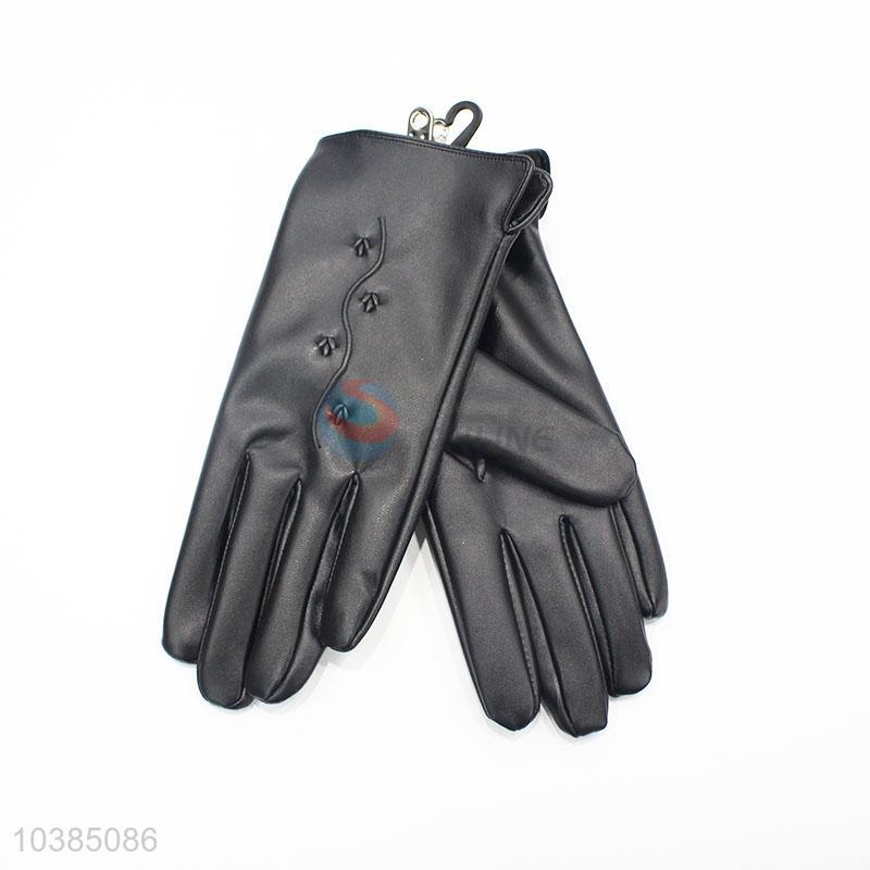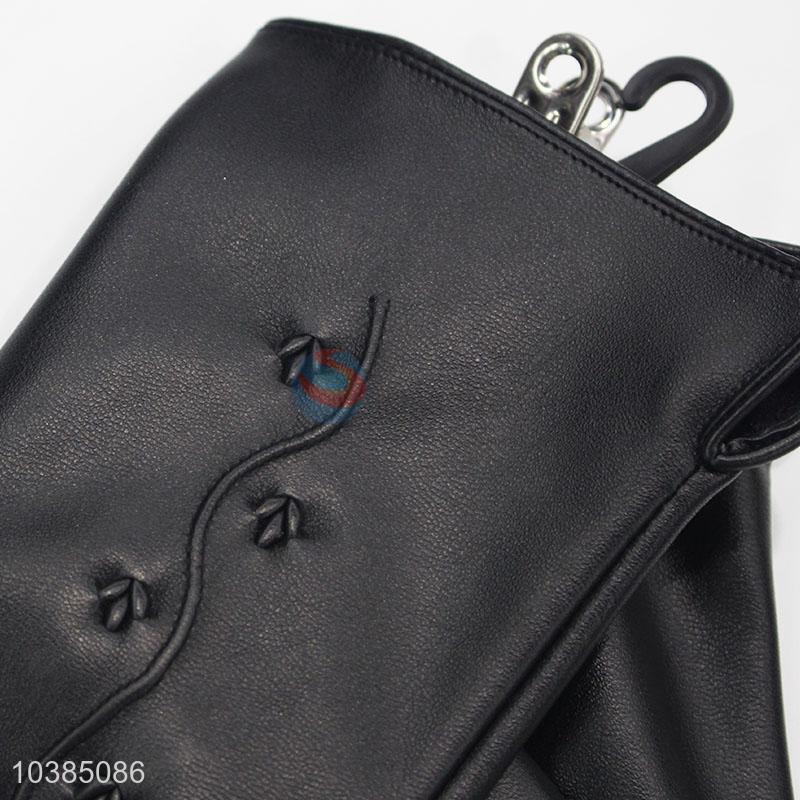Classic Women Black PU Leather Winter Warm Flower Gloves