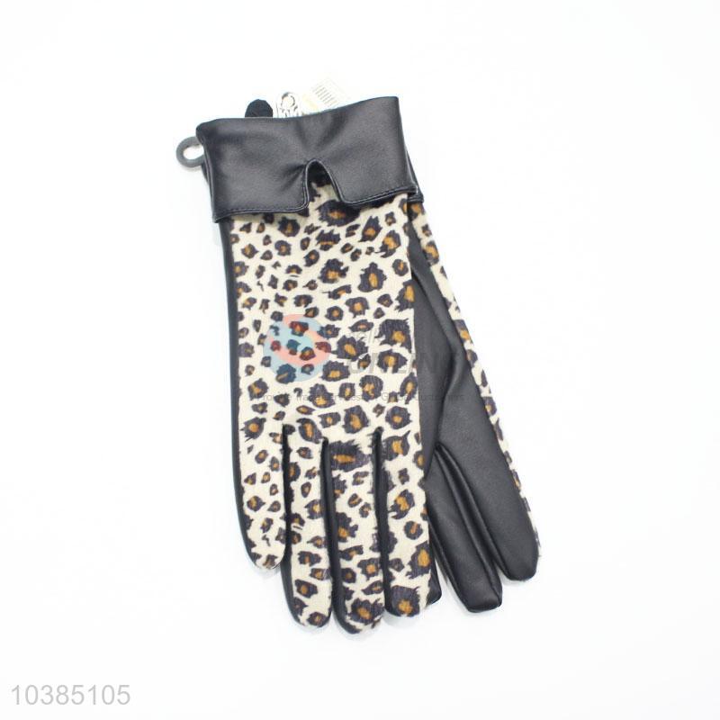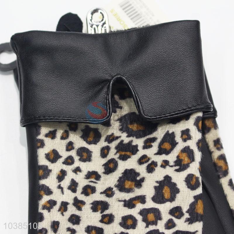 Winter Warm Mitten Women PU Leather Leopard Printed Finger Gloves